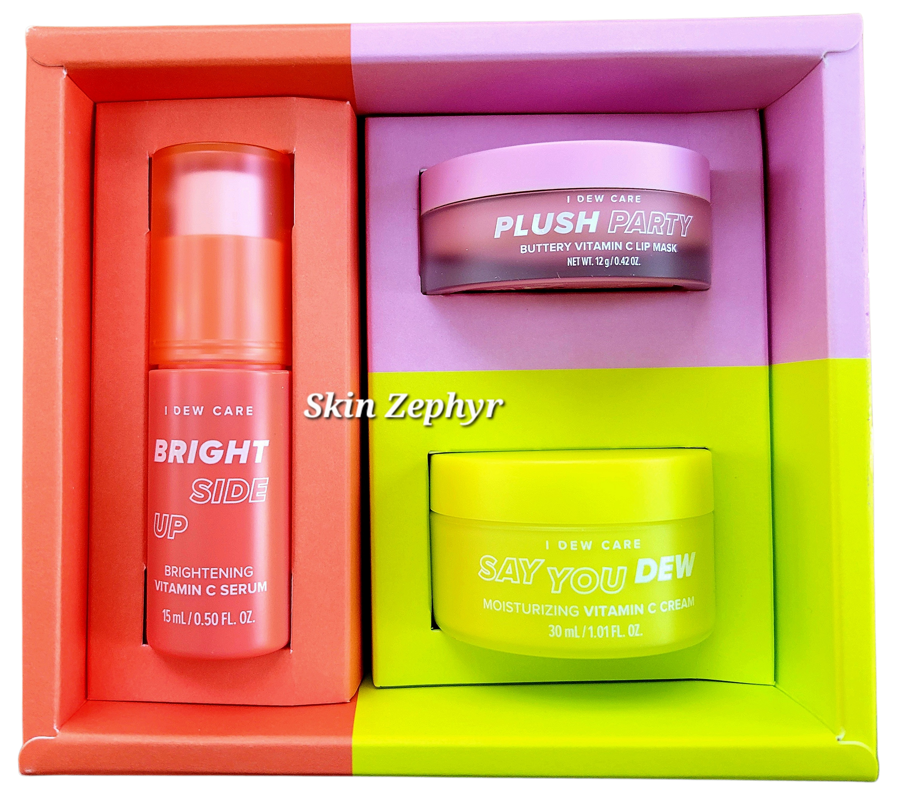 - GLOW ON THE GO FOR GLASS SKIN: Vitamin C-rich product trio that comprises of travel sized serum [Bright Side Up 15ml/0.50 fl oz.], moisturizer [Say You Dew 30ml/0.50 fl oz.], and lip mask [Plush Party 12g/0.42 oz] to illuminate and moisturize skin on the go.